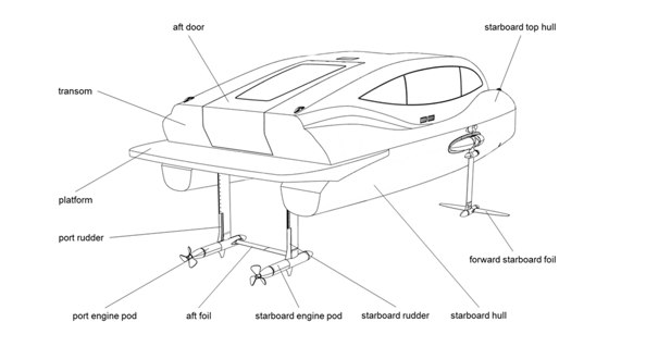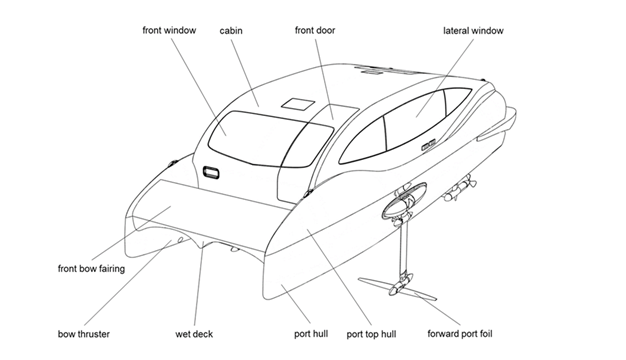 This illustrates the major parts of the boat shell structure, like the hulls, wet deck, cabin, transom, and front bow fairing. Besides that, the major systems of the boat, like the forward foils, aft foils, and propulsion systems, are identified as well
